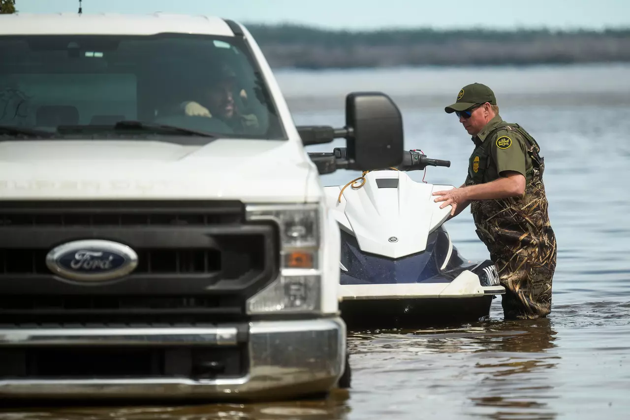 A U.S. border patrol agent loads a personal watercraft back onto a hitch hauler after taking it out on Black Lake while helping other law enforcement agencies looking for homeowners who may need help evacuating on April 17, 2026, in Cheboygan, Michigan.